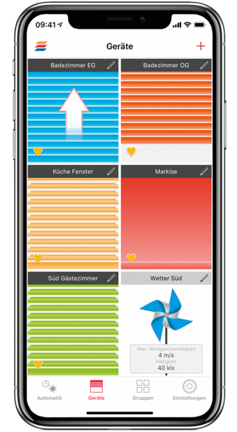 Kumanda edildiği anda canlı geribildirim ile lamellerin görünüşü ekranınızda olur. Ayrica rüzgar veya günes gibi sensör degerleri görüntülenir. Gruplar oluşturabilir ve tüm güneş koruyucularınız için en sevdiğiniz pozisyonları ayarlayabilirsiniz."